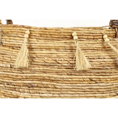 Solve your storage issues stylishly with this pair of naturally brown and beige, large round storage baskets, handmade with banana leaf wicker. Each eclectic wicker basket has beige wooden beads dropping beige tassels around the tapered top. The thick, coiled handles on the sides are made from sun-dried banana leaves, jutting out from the pot belly-shaped body, which displays tightly stacked wicker cords secured by clear line for a tight, coil weave design. The clear acrylic string creates a subtle starburst pattern on the interior base for a little extra hidden pop of style! These oval baskets nest together for easy (very cool looking) storage.