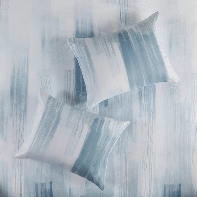 The N Natori Brush Stroke 4 Piece Reversible Seersucker Comforter Set elevates your bedroom with its simple and elegant lounge style. This reversible comforter flaunts a broad brushstroke print on seersucker heatset fabric to create a luxurious lustrous look. The reverse features a narrow brushstroke print to contrast the design on the face, giving you two artistic looks for the price of one. Matching shams and a coordinating decorative pillow add the finishing touches to the seersucker comforter set. Oversized and overfilled for better coverage on high depth mattresses, this reversible comforter set brings a casual elegance to beautify your bedroom décor. Machine washable for easy care. This bedding set may come in rolled or compressed packing and will need to be fluffed up.