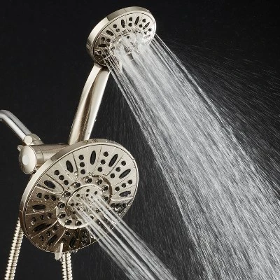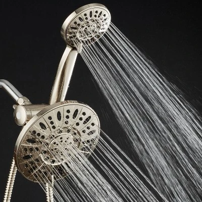 This AquaDance High-Pressure 48 Setting Luxury showerhead combo has one of a kind features! Comes in a premium spot-resistant Brushed Nickel finish that won’t scratch, chip, or fade. Choose from 12 different single options or 36 mixed water flow patterns. The 6 flow settings include Rain, Massage, Mist, and Pause, and two mixed modes. A 7″ face Slimline rainfall shower head for extra-wide flow coverage and a large 4″ face Slimline hand shower for higher flow velocity and water efficiency. Patented 3-way water diverter for directing water flow to either one or both showers. Anti-clog rub-clean jets for easy cleaning and preventing lime buildup. You can use the showerheads either together or separately according to your showering preferences. Each shower features a high-power 3-zone PrecisionFlo(TM) dial for superior water pressure. Comes complete with all washers, plumber’s tape, and easy-to-follow instructions. Limited lifetime warranty with 100% hassle-free return policy directly from the manufacturer.