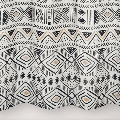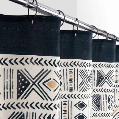 - Dramatic printed global inspired design featuring a medley of geometric motifs in black with honey on cream that will bring sophisticated style and bold texture to your bathroom 100% textured polyester