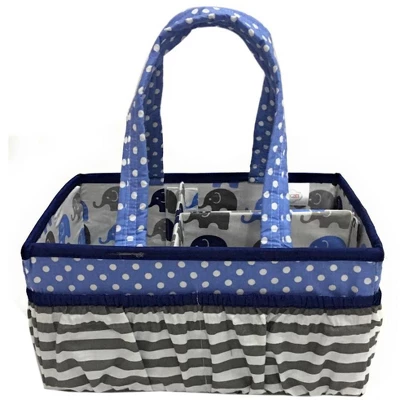 Add organization to any area of your home with the portable Nursery/Toddler Storage Caddy by Bacati. Perfect for dressers and changing stations, this lightly padded caddy has 8 outer pockets and a removable “T” separator for maximum versatility. The soft cotton percale fabric with stiffner inside keeps the shape intact, lining and handles feature a padded with polyfilled and cordinating trim. Keep diapers, wipes and other necessities tidy while traveling from room to room. Caddy also functions as an organizer for crafts, picnics, pet supplies, etc. Measures 12.5 in x 6.25 in x 8.5 in.