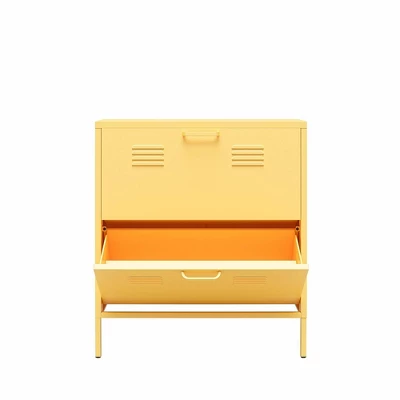 Bring a bit of nostalgia and a bunch of organization to your home with the Cache 2 Door Locker Style Metal Shoe Storage Cabinet from Novogratz. Available in several fun colors, the Cache is designed with all your shoe storage needs in mind. Two sturdy metal drawers fold out to keep your shoes right where you need them without cluttering up your entryway. The durable metal construction not only looks great but can easily be wiped with a damp cloth for easy cleaning. The 2 Door design accommodates up to 12 pairs of average-sized tennis shoes, with enough space for a US women’s size 14 shoe! The Shoe Storage Cabinet must be anchored to a wall. A wall anchor kit and instructions are included. The Cabinet ships flat to your door and requires assembly upon opening. Two adults are recommended to assemble. Once assembled, the Cabinet measures to be 35.24” H x 31.5” W x 10.24” D.