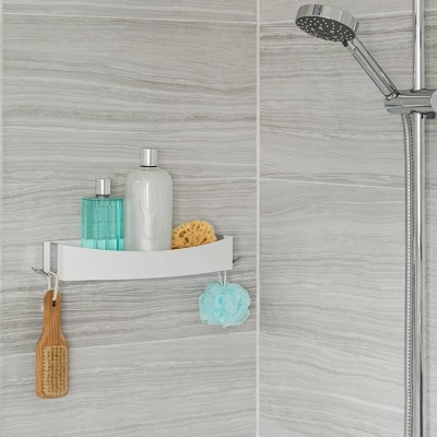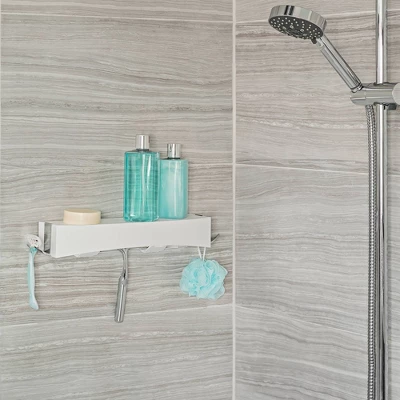 - Removable hooks hold razors and loofahs Additional included hooks can be used underneath to hang a squeegee when in “shelf-mode”