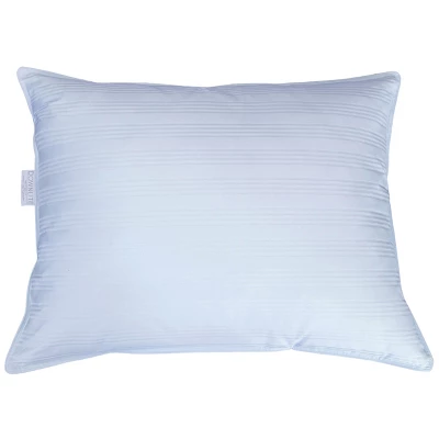 Specifically designed to create a comfortable flat surface for sleepers who suffer from neck and back issues. With minimal fill, this extra soft down pillow has none of the loft associated with most down pillows. Filled with our Rest Assured Hypoallergenic Down, this pillow is machine washable, helping cut back on allergens. Now your can have the luxury of down without the loft. This is the least filled pillow we make. Very flat pillow-specifically made stomach sleepers only. (Note -Down is a Minimum 75% white duck down and 25% loose white duck down clusters or small feathers.)Savor a pillow made just for your stomach-sleeping ways, with this extra-soft down pillow. The flat shape and soft density provide ideal support for sleeping on your stomach.Newly updated we have upgraded this item to a silky soft 500 thread count long staple cotton damask fabric. We designed our Ultra-Flat, Ultra-Thin pillow with stomach sleepers in mind. This pillow features 525 – 550 Fill Power Premium White Down fill that is soft and cozy and wrapped in a silky soft 500 thread count long staple cotton fabric. Great for stomach sleepers or as an additive layer on top of your other pillow(s) to create additional softness.Features: Wholly cotton shell with white down fill Ultra Flat, Ultra Thin, and Extra Soft RDS Certified Down Includes 1 extra-soft stomach sleeper pillow only Blue damask pattern on entirely cotton damask fabric shell Silky Soft 500 thread count long staple cotton damask fabric (The former version was a light blue color with a 250 TC fabric) White down fill for natural coziness 525 to 550 fill power Hypoallergenic design Sold Individually Ships Rolled for ecoFriendly Shipping (Simply throw in dryer for 10 minutes to fluff up) Machine washable Assembled In The USA of Imported MaterialsSize Options: Jumbo: 20 inches wide x 28 inches long / weighs 13 oz. in White Only 500TC King: 20 inches wide x 36 inches long / weighs 16 oz.in White Only 500TCPlease note: This is a very flat pillow. Some customers have bought this pillow thinking extra soft means extra fluffy; this is not the case. It is also a great way to add a layer of cushion on an existing feather pillow.