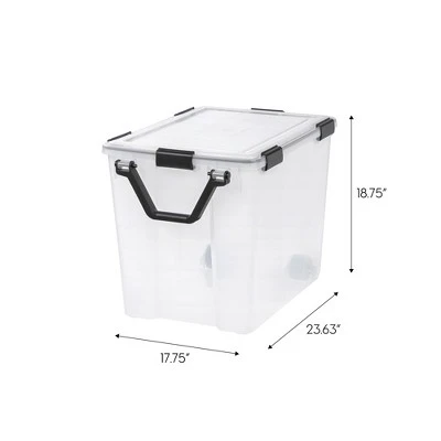 Store your favorite keepsakes and other valuables in this IRIS 19 Quart WeatherPro™ heavy-duty storage tote. The WeatherPro™ seal on the storage bin lid protects contents by keeping air and moisture out. Safely store up to 25 pounds of material, such as crafting supplies, photos, and movies in these small storage containers. The grooves in the reinforced lids means these 19 quart stackable totes with lids can be placed on top of each other to save space, stack two of the 6.5 quart boxes securely on top of the 19 quart Iris tote, or stack two 19 quart totes on top of the 41, 62, 74, or 103 quart totes to create a customized storage solution.