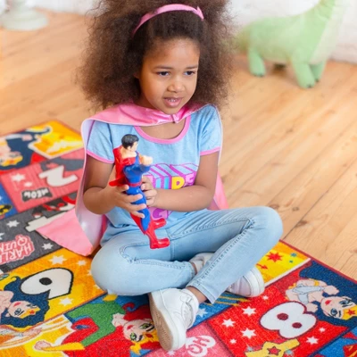 Officially LicensedKids find that everything is possible in their fantasies, whether they’re acting out classic adventures with their favorite characters or combining worlds to create entirely new stories. KC Cubs rugs help unlock the whole universe for your child. Get your child moving and having fun while learning about the values of truth, love, and justice with this dynamic and colorful hopscotch rug featuring beloved female DC Comics super heroes and villains like Wonder Woman, Batwoman, and Poison Ivy. Suitable for indoor or outdoor use, this rug is sure to inspire hours of imaginative play and personal growth.Immersive DesignCreated with both kids and JUSTICE LEAGUE loving adults in mind, play endless scenarios with your favorite childhood cartoon characters. Transform your child’s space into the Hall of Justice with this dynamic and bold Justice League rug, featuring all your favorite DC Comics super heroes. This Justice League rug is the perfect addition to any child’s super hero-themed bedroom or playroom. With its bold design and vibrant colors, it’s sure to inspire endless imaginative play.Make learning and playtime more fun with our adventure-filled educational kids rugs!KC Cubs Educational and Learning Game Rugs are carefully designed to stimulate your child’s curiosity, giving them opportunities to learn while playing with all of their favorite toys making them the perfect addition to your child’s learning experience! Harness the power of learning through play!Our rugs will help your child simultaneously learn and grow their imagination. From sounds to colors to animals we have it all. So, whether you want to help your child identify numbers and learn to count or if you’re ready to take them on a tour of the universe, there’s a rug that will help you do just that. Designed with the help of early childhood educators and parents, you won’t find rugs like this anywhere else. Not only are these rugs attractive and colorful, but they are also safe for use in schools and daycares as they meet the standard for surface flammability.Have fun while teaching your young ones!Whats better than unlocking you inner child and having an adventure with your favorite little ones. KC Cubs rugs promote interactive play and make-believe game play. Join parents around the country who are embracing the power of educational play with KC Cubs Rugs! Find the rug that’s right for you and your child and let the fun begin! They also are a great fit for any preschool, kindergarten, elementary school, daycare, or library with the 8 x 10 size. Add a splash of color and excitement to the children’s learning journey with KC Cubs educational rugs! Our Play + Social Skill Rugs also help kids form friendships by having them learn to share by taking turns in creating adventures and devoloping their communication skills by making them conversate with other kids.