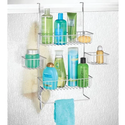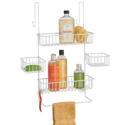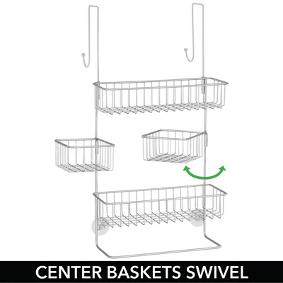 Keep all of your shower go-to’s close by with this Over Door Hanging Shower Caddy from mDesign. Four baskets and a washcloth bar hold all of your shower essentials in one convenient place. The two smaller baskets swivel to make room for larger shampoo and conditioner bottles on the bottom shelf. Install the caddy instantly by hanging over your shower door; two suction cups help it stay in place. Two hooks hang outside the shower to keep towels dry and close by. Water flows away through the gridded design, letting items dry completely and quickly between every use. mDesign – more calm, less clutter