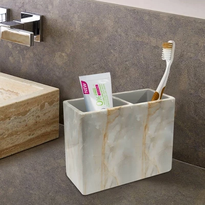 - A compact footprint allows each accessory to fit even the most crowded counter spaces. Hardy resin is chosen for its ability to last years in moisture-rich environments, and the marble pattern finish does not fade even when in contact with bare hands, water, or soap.