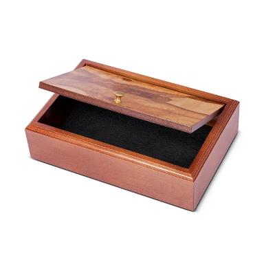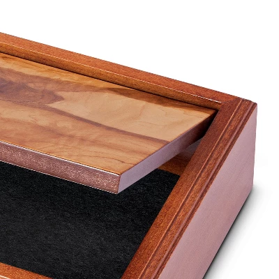 This Old-World solid wood box brings beauty, organization and practical storage space. A wooden box that is skillfully crafted to graciously store your most precious belonging. Keep your wallet, money clip, extra coins and car keys stylishly concealed. Perhaps store family photos, or beloved heirlooms. Walnut stained mitered box with a framed styled lid covered with an olive wood veneer, this versatile vessel continues the fine tradition of boxes throughout history, combining function with decorative purpose, and will be cherished for its fine craftsmanship for generations.